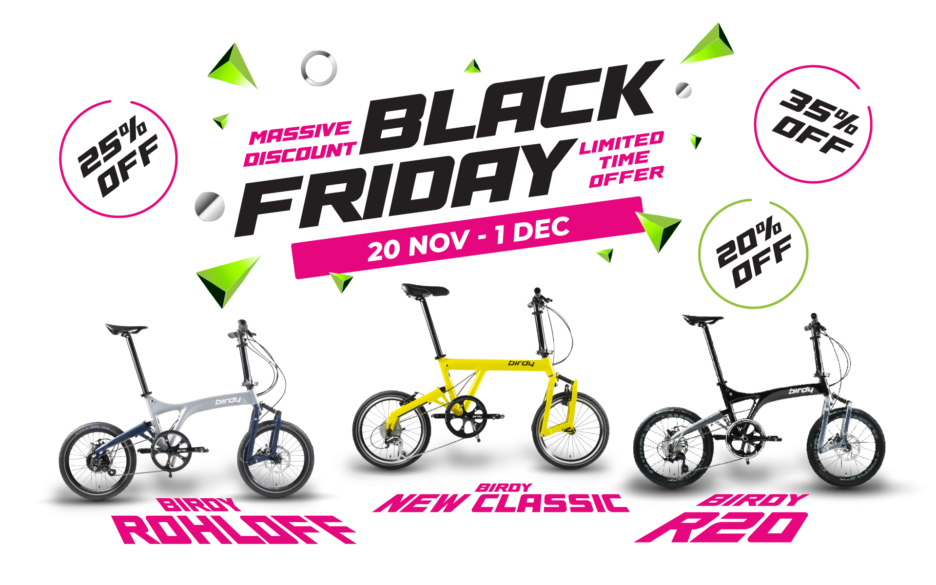 The Birdy DA20 Dura-Ace is the ultimate foldable speed demon. It’s equipped with slim, aerodynamic 20” Panaracer tyres and a high-performance Hubsmith wheelset. Its TRP Spyre brakes and full front & rear suspension grant you control and comfort even at high speeds. But what truly stands out about the Birdy DA20 is the Dura-Ace rear derailleur and Dura-Ace titanium cassette. It combines the best of Shimano’s components that are light, durable and used by professional riders for its longevity and performance demanded by them, and now available to you on the Birdy!