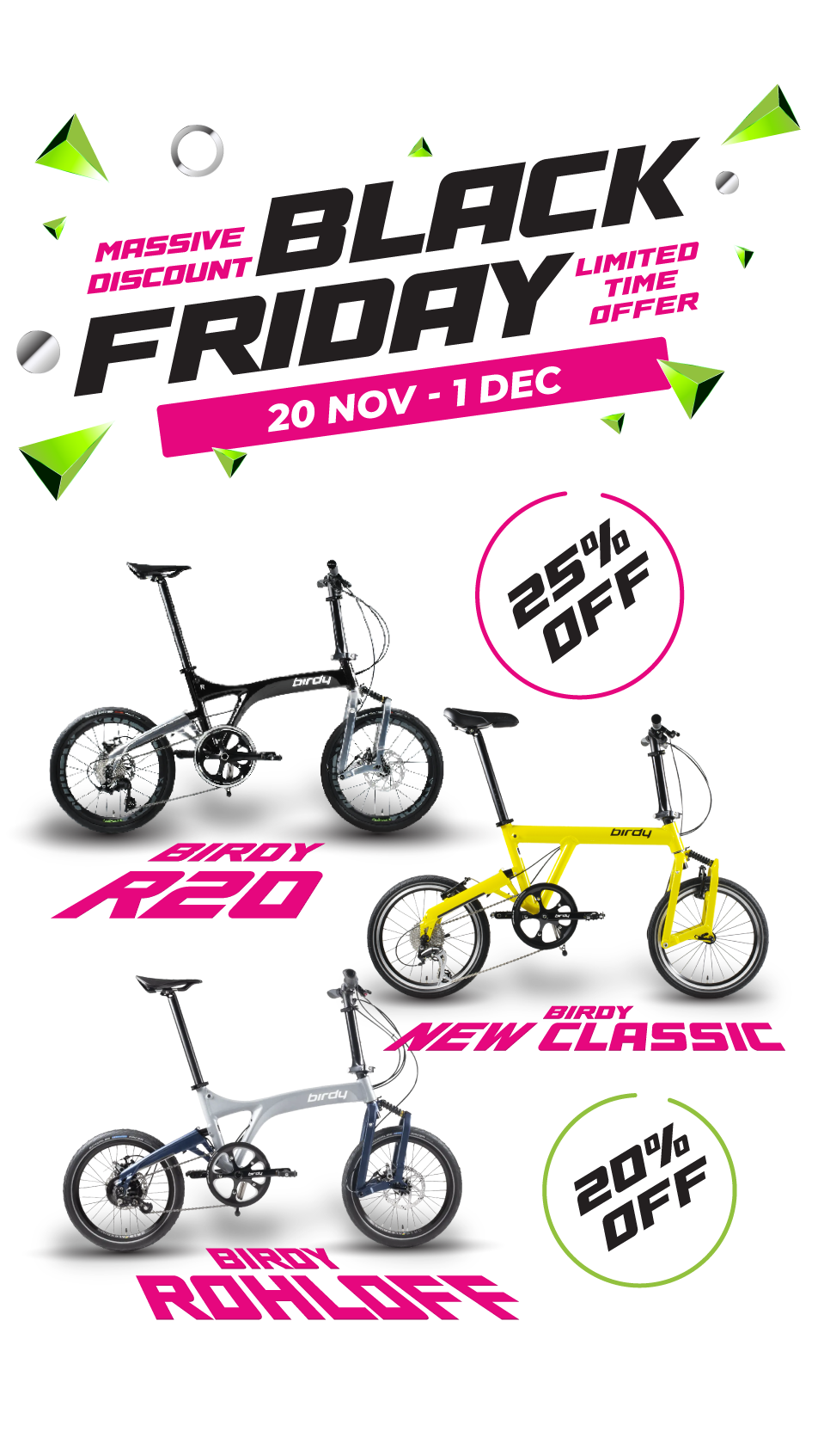 Standard S$45 local delivery fee applies for CarryMe and CarryAll. Store collection only for Birdy, Reach GT, IF Move and iruka. For bike accessories that cost S$180 and below, there will be a S$10 local delivery fee. For bike accessories orders above S$180, there will be no local delivery fee.